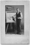 Description: Albert Schlechten (1876-1962) standing in front of one of his paintings on an easel. He attended art school in Switzerland before coming to the U.S. Vintage 3.5x5.5 in. print.